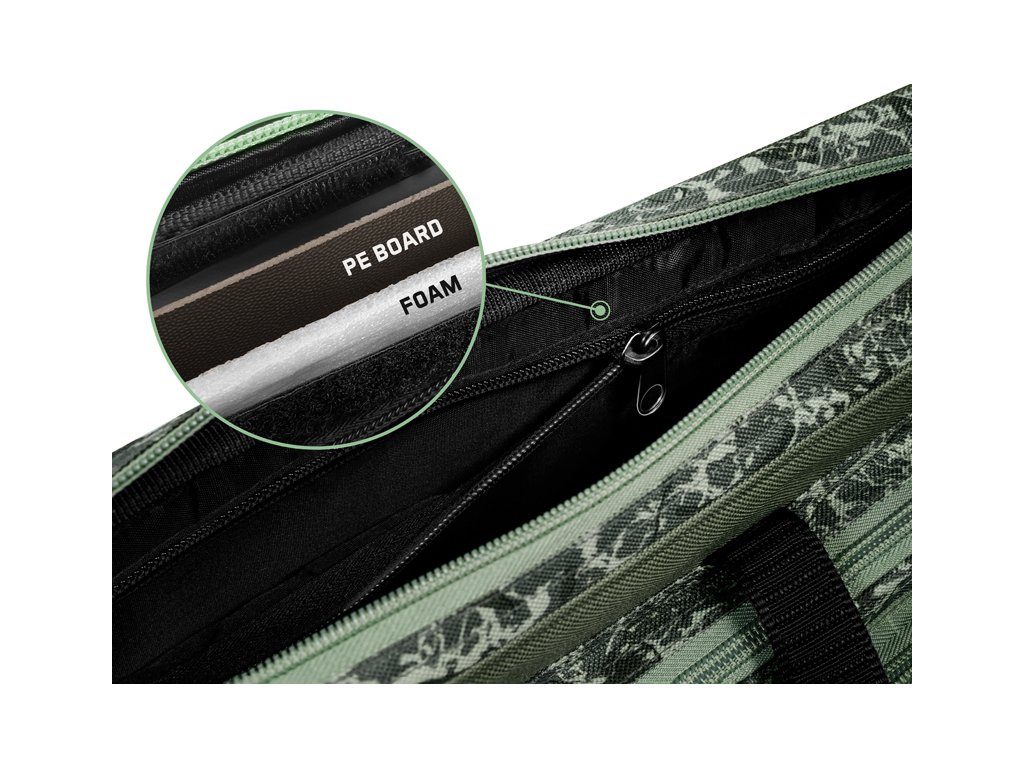 Delphin SPACE je označení pro exkluzivní sérii tašek z dílny značky Delphin. Vyznačuje se špičkovým zpracováním, kvalitními zipy, ale zejména výjimečným designem s použitím C2G kamufláže. Taška Delphin NTB+ byla navržena vzhledem k požadavkům moderní doby, kdy stále větší množství rybářů nosí s sebou k vodě notebook. Ať už ho berete kvůli pracovním povinnostem nebo zábavě, vždy je dobré jej mít během transportu důkladně chráněn. A právě pro tento účel je taška NTB+ jako stvořená. Hlavní komora tašky disponuje dostatečným místem pro uložení všech standardně prodávaných notebooků o rozměru 15,6 palců. Kromě tohoto rozměru lze do pouzdra pohodlně vložit i větší notebooky až do rozměru 17 palců, zde záleží na poměru stran a tloušťce samotného notebooku. Maximální rozměry pro notebook jsou uvedeny níže v tabulce, ale také v galerii obrázků. Díky tvrdým stěnám (PE deska všitá ve stěnách) a měkkému polstrování bude váš notebook důkladně chráněn před nárazy a nechtěným poškozením. Kromě toho se uvnitř nachází velká zipovatelná kapsa umožňující sbalit různé dokumenty. Na přední straně jsou umístěny tři kapsy, přičemž každá z nich má své nepostradatelné využití. Největší kapsa je určena speciálně na nabíječku, přičemž bez problémů pojme i nabíječky s opravdu velkými adaptéry. Dvě menší kapsy zase umožňují sbalení dodatečného příslušenství či psacích potřeb. Spodní strana tašky a boky do výšky 4 cm jsou opatřeny odolnou nepromokavou látkou, díky které se nic neděje ani pokud tašku položíte na mokrou či špinavou zem. Během transportu se o komfort stará mimořádně měkké polstrování popruhu pro zavěšení na rameno či praktické rukojeti pro nošení tašky v ruce. Technické parametry: Celkový rozměr: 43x31x5cm Vnitřní prostor pro notebook: 40.5 x 30.5 x 4.5 cm Rozměr přední velké kapsy: 36x23x4cm Rozměr přední střední kapsy: 20x18x3cm Rozměr přední malé kapsy: 10x19x3cm Stylová patentovaná kamufláž z dílny značky Delphin pod označením C2G má mnoho podob a úhlů pohledu. Přesně tak i její název, který můžeme volně přeložit jako Carpath 2. generace, což přímo odkazuje na jejího předchůdce, ale můžeme jej číst i jako Carpath to Green, tedy přechod myšlenky Carpathu do zelené barvy. Její jedinečnost a nezaměnitelnost spočívá v prvcích, ze kterých je vytvořena. Na první dojem jde o kamufláž tvořenou třemi různými odstíny zelené. Všechno se však změní při detailnějším pohledu, kdy si všimnete siluety kaprů, komponent kaprařské montáže a log značky Delphin spolu s označením C2G. Díky tomuto neopakovatelnému provedení se vaše rybářská výbava okamžitě stane jedinečnou a maximálně originální.Doplňkové parametry