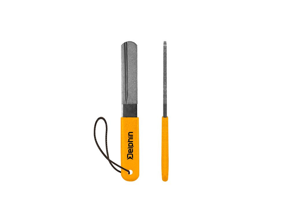 Dokonalý brousek! Tento brousek od slovenské značky Delphin je vyroben z nejkvalitnějších materiálů. Diamantová plocha brousku je určena pro ostření nože a žlábek pro ostření háčku. Na konci protiskluzové pogumované rukojeti se nachází pojistné lanko na zápěstí a zaoblené rohy brousku jsou zárukou naprosto praktického použití.Doplňkové parametry