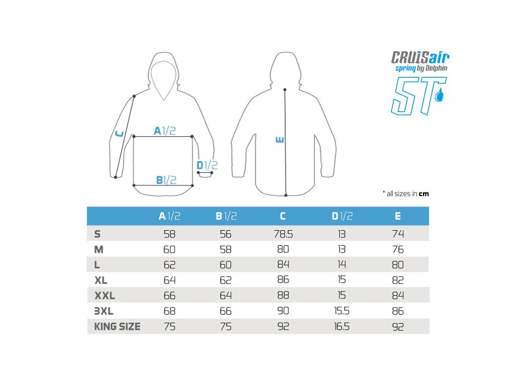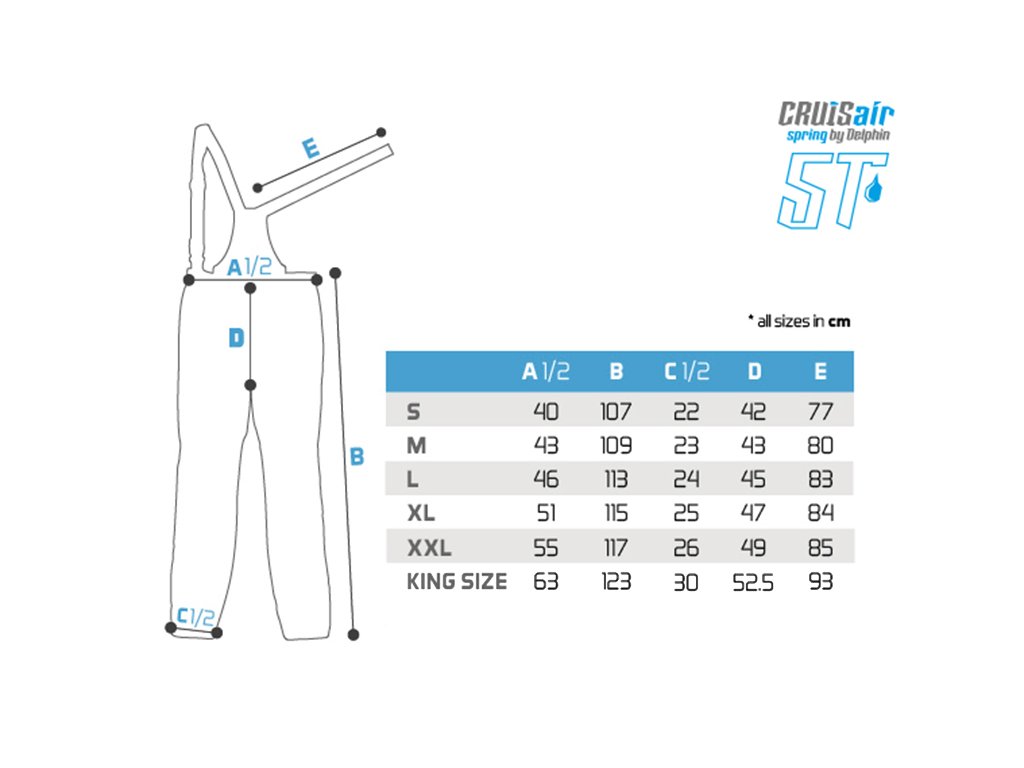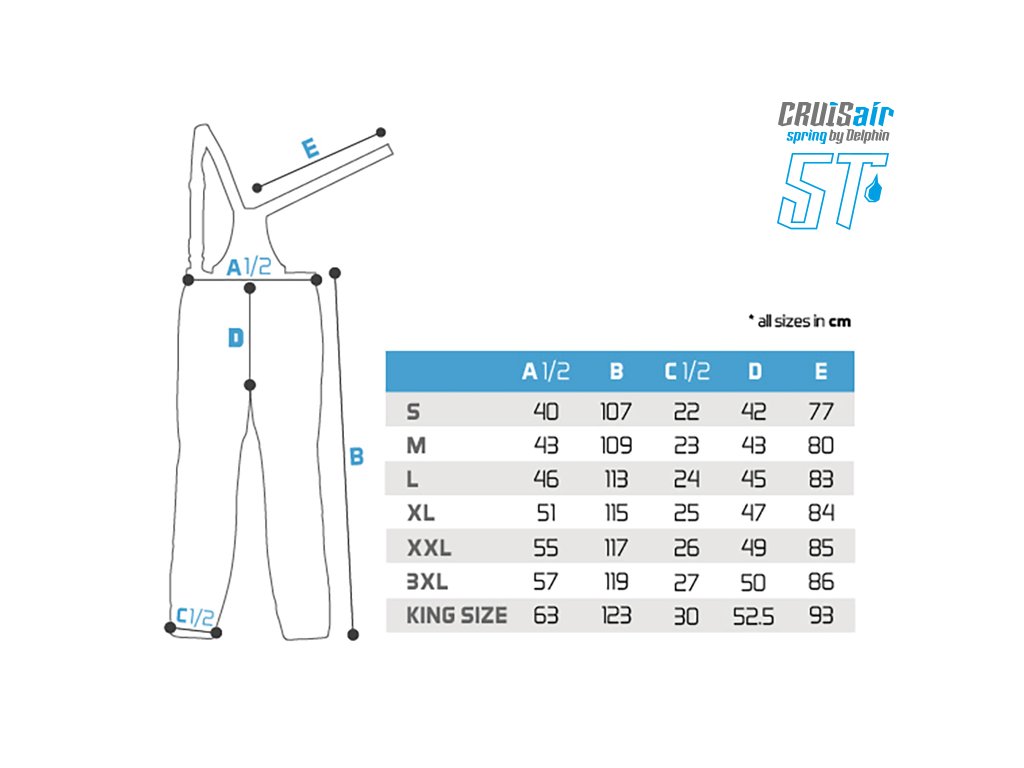 Dýchatelné svrchní oblečení nabízející excelentní ochranu vůči nepříznivým podmínkám, a to zejména dešti a větru. Delphin CruisAIR SPRING 5T je svými parametry vhodný zejména pro přechodné období jara a podzimu, kdy je počasí často nevyzpytatelné. Komplet CruisAIR SPRING 5T se skládá ze samostatně prodávané bundy a kalhot, což vám dává možnost nakombinovat si správnou velikost každého dílu. Nekompromisní kvalita použitých materiálů a odolnost vůči živlům perfektně charakterizují tento komplet. Nabízí vodní sloupec 5000mm ve spojení s paropropustností 3000g/m2/24h, díky čemuž vás nepřekvapí ani intenzivní liják, zůstanete v suchu a jen tak snadno se v něm nezpotíte. Bunda Vnitřní strana bundy je opatřena síťovinovou látkou, která zamezuje dotyku kůže s vnějším materiálem. Kromě toho je na dotek velmi příjemná, čímž zvyšuje pohodlí během nošení. Uvnitř je i velmi praktická zipovatelná kapsa, vhodná například na doklady, či jiné cennosti. Dvě kapsy se nacházejí i na vnější straně bundy, přičemž disponují voděodolnými zipy, díky čemuž nehrozí zatečení vody dovnitř. Zapínání bundy je zajištěno pomocí odolného zipu, který je překryt pásem tkaniny se suchými zipy. Rukávy jsou na zápěstí regulovatelné pomocí popruhů se suchým zipem a tedy je možné si je pořádně utáhnout a minimalizovat vtékání vody po rukou. Ve spodní části bundy se nacházejí po bocích gumičky umožňující zatáhnutí a přizpůsobení dle vašich potřeb. Nejvíce namáhané části jsou překryty černou tkaninou odolnou vůči poškození a fyzickému zatížení. Samozřejmostí na bundě je kapuce, stahovatelná dvěma gumičkami. Kapuci je navíc možné odepnout pomocí zipu a bundu tak využívat i bez ní. Kalhoty Jednou z hlavních výhod kalhot je vyvýšený pas v oblasti křížů, čímž bude spodní část vašich zad dokonale chráněna. V oblasti hýždí a kolen se nachází zesílená černá látka, jejímž úkolem je ochrana před znehodnocením, těchto používáním nejvíce náchylných částí kalhot. Elastické kšandy se zapínáním na klipy zaručí, že kalhoty budou dobře sedět a nebudou vám padat. Zapínání pasu je provedeno z kvalitního zipu a 2 kovových cvoků, nechybí ani poutka po obvodu sloužící pro použití pásku. Ve spodní části lze kalhoty regulovat pomocí krytého zipu a zatahovacího pásu se suchým zipem. Při praní doporučujeme použít speciální prací prostředek na funkční oblečení, prát při max. 30°C, neždímat, nežehlit a v případě potřeby použít impregnační přípravek, který obnoví vodoodpudivou úpravu vnějšího materiálu.Doplňkové parametry
