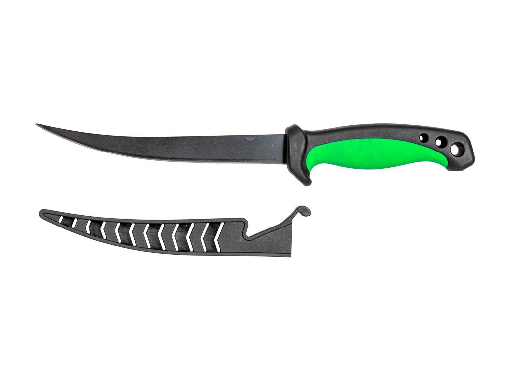 Filetovací nůž s tenkou, pružnou, a zároveň extra ostrou a pevnou čepelí z nerezové oceli s nelepivou povrchovou úpravu a snadno čistitelnou plastovou rukojetí. Součástí výbavy je i plastové pouzdro, které chrání ostří nože a přítlačná pojistka zároveň brání nechtěnému vypadnutí z pouzdra. - Délka čepele: 16,5 cm - Délka rukojeti: 12 cm Výrobce: Carp ZoomDoplňkové parametry