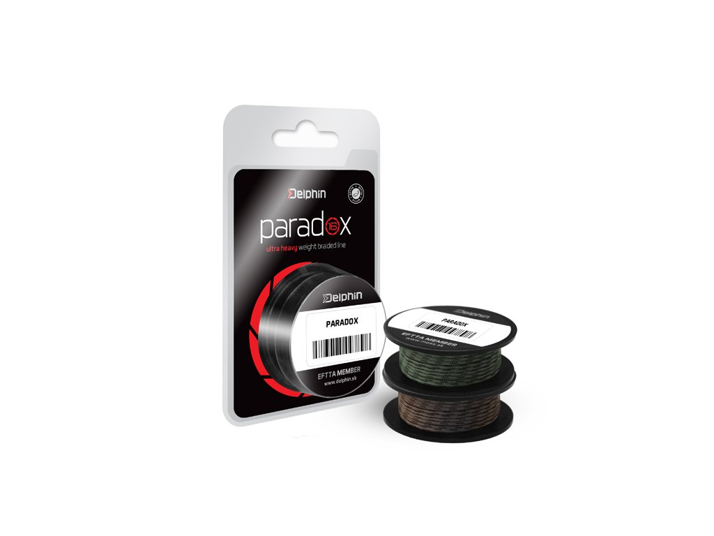 "...těžká jako "leadcore", avšak bez olověného jádra..." PARADOX je revoluční šňůrou z dílny Delphin. Pro výrobu bylo použito 16 výjimečných mikrovláken, které jsou několikanásobně těžší v porovnání se standardními PE vlákny. Navíc je šňůra extrémně hustě pletená, což do maximální míry zvyšuje jejich množství na 1cm šňůry. Šnůra je tak mimořádně těžká a oděruvzdorná. Speciálním pletením je dosažena dutá středová část, což umožňuje vytvářet bezuzlové smyčky pro garanci stejné nosnosti návazce po celé jeho délce. Tato šňůra neobsahuje olověné jádro, ale přesto je těžší oproti běžnému „leadcore“. Dokonale kopíruje dno a vytváří tak neviditelný kaprařský návazec. Vzhledem na její charakteristické vlastnosti je určená do nejtěžších vod s množstvím překážek, mušlí či raků.Doplňkové parametry