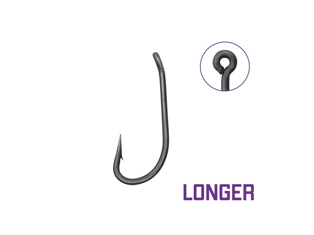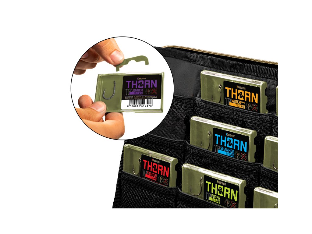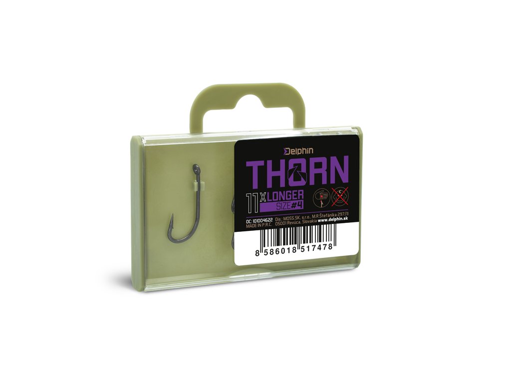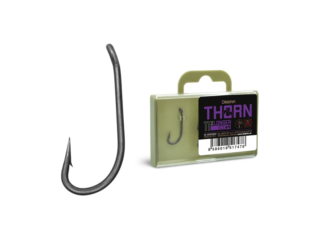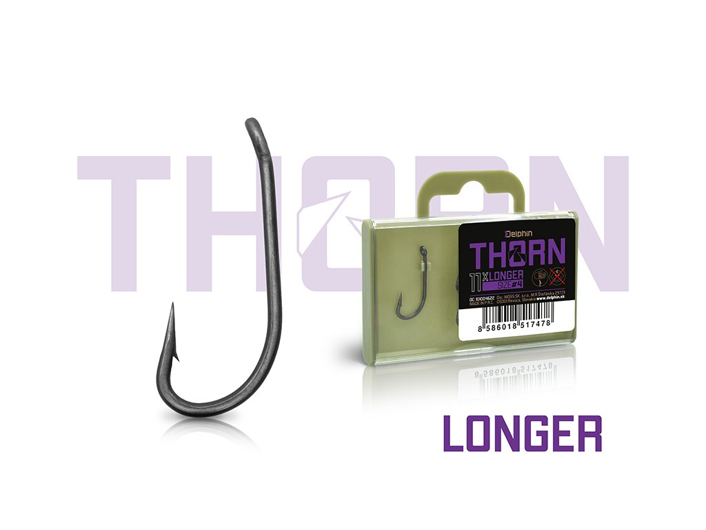 Delphin THORN je prémiová řada kaprařských háčků nejvyšší kvality. Díky moderním technologiím, které byly použity při výrobě, jsou tyto háčky synonymem nekompromisní pevnosti a maximální ostrosti. Háčky ze série THORN disponují titanX povrchovou úpravou, čímž nabývají matný šedý povrch, který je navíc dokonale hladký pro snadné proniknutí do kapří tlamy. TitanX se stará také o zpevnění a odolnost celého háčku. Pomocí aplikované technologie Ultrapoint 4.8 bylo možné vytvořit delší hrot, který poskytuje přímo neuvěřitelnou ostrost. Háčky Delphin THORN jsou baleny v praktické krabičce, ve které bude jejich ostří vždy důkladně chráněno. Na krabičce se navíc nachází držák s očkem na zavěšení do prodejen, který lze snadno odstranit odlomením bez jakéhokoli nástroje, díky čemuž krabička ve vaší výbavě zabere podstatně méně místa. THORN Longer je typický svým dlouhým a rovným ramínkem se zahnutým očkem, malým obloukem a rovným dlouhým hrotem. Všechny tyto vlastnosti napomáhají extra rychlému otočení a vniknutí háčku do tlamy kapra. Pokud hledáte model, na který budete mít spoustu záběrů a dobře si zachytáte, pak je Longer tou správnou volbou právě pro vás. Tento tvar háčku je univerzální, takže s ním lze lovit na potápivé, neutrálně vyvážené i plovoucí nástrahy.Doplňkové parametry