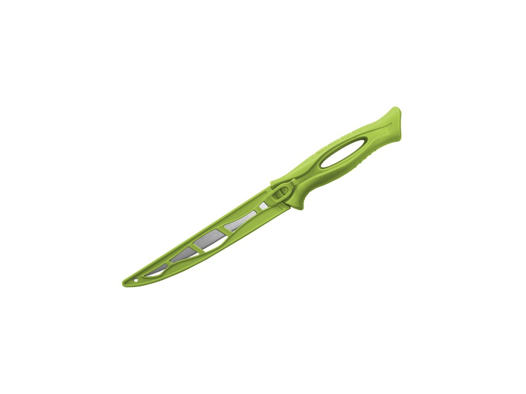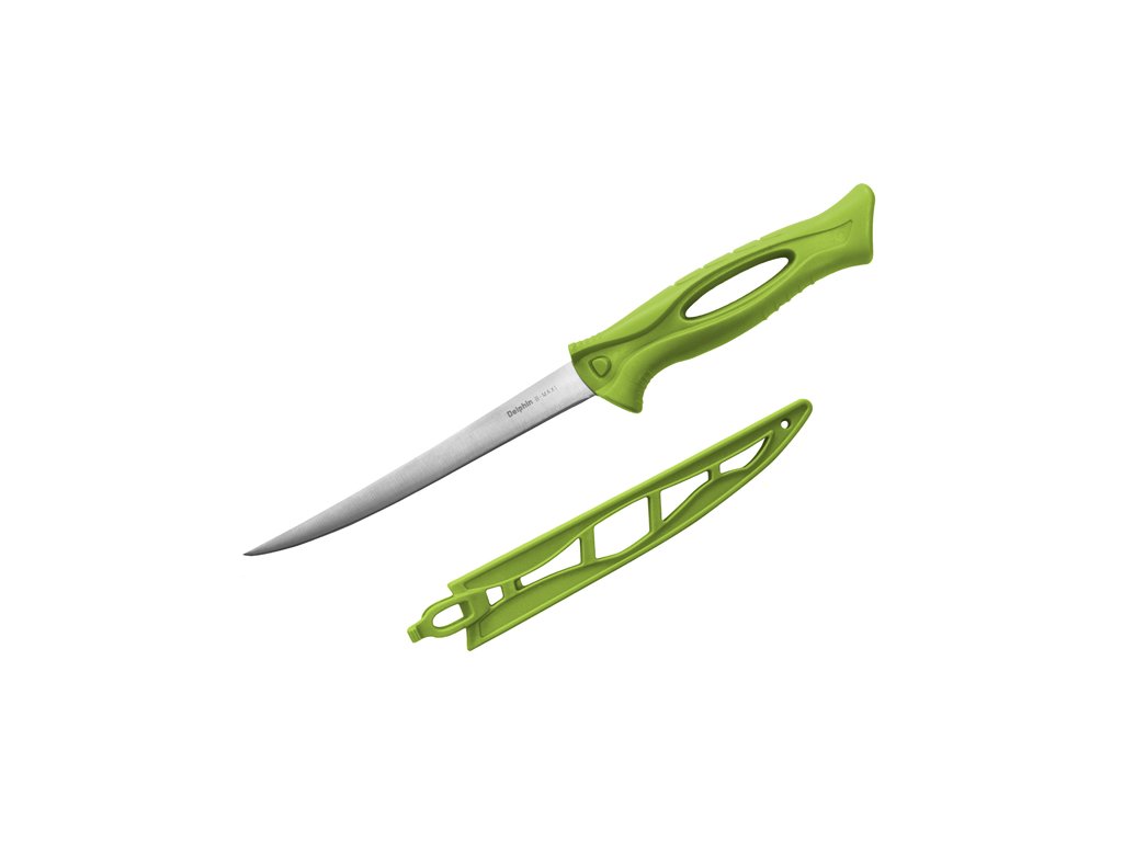 Jednoduchý "fileťák" B-MAXI má extra ohebnou čepel, díky které rychle vyfiletujete rybu či zpracujete maso. Čepel a pouzdro je výrazné zelené barvy, a tak se ve vaší rybářské výbavě neztratí. Hodí se i jako skvělý společník do dílny a zahrady. Je velmi lehký, dodává se s bezpečným plastovým pouzdrem. Technické parametry: Delphin B-MAXI Celková délka: 285mm Délka čepele: 153mm Výška čepele: 20mm Tloušťka čepele: 1,2mm Materiál čepele: nerezová ocel Hmotnost: 58gDoplňkové parametry