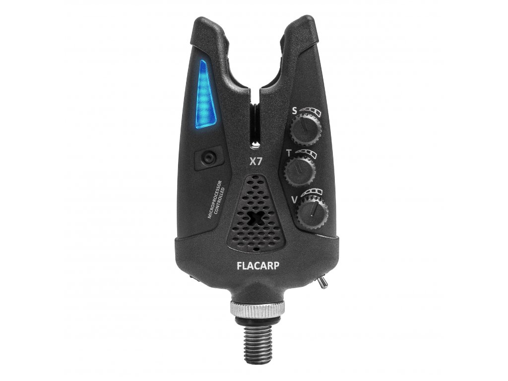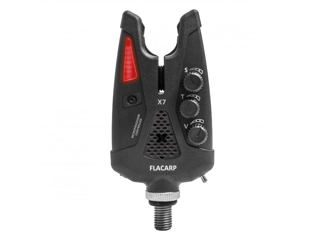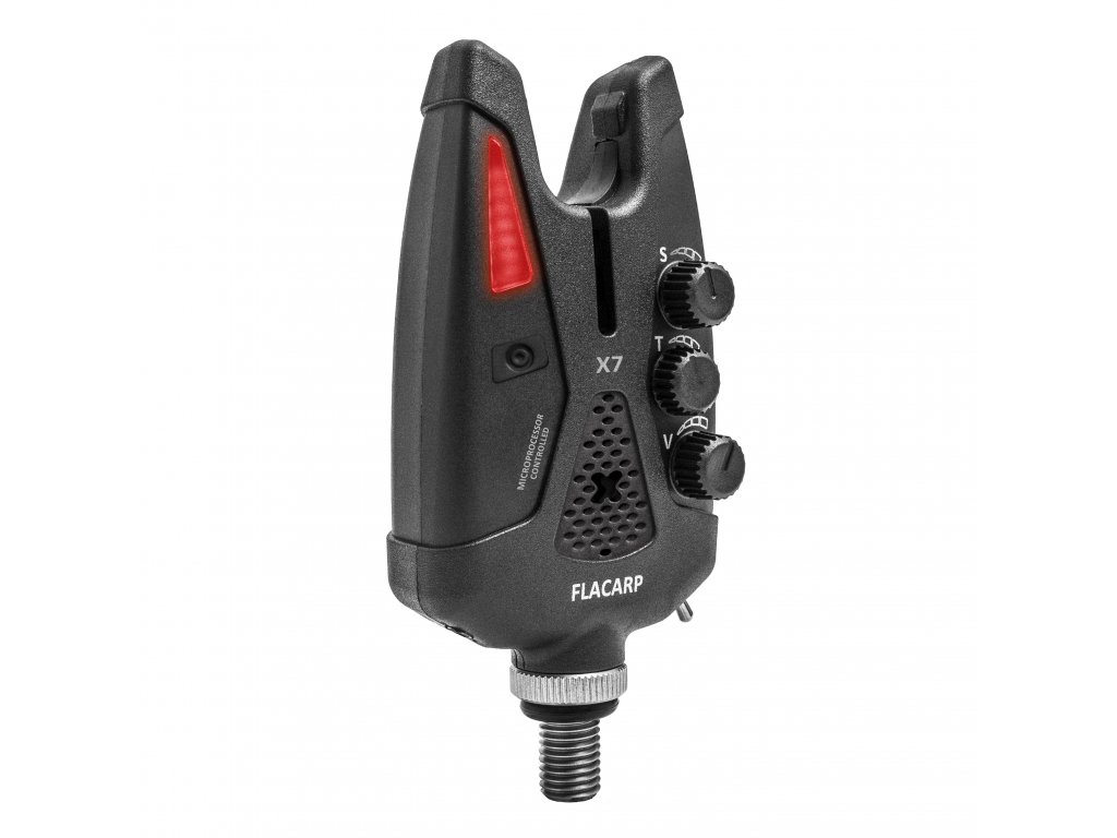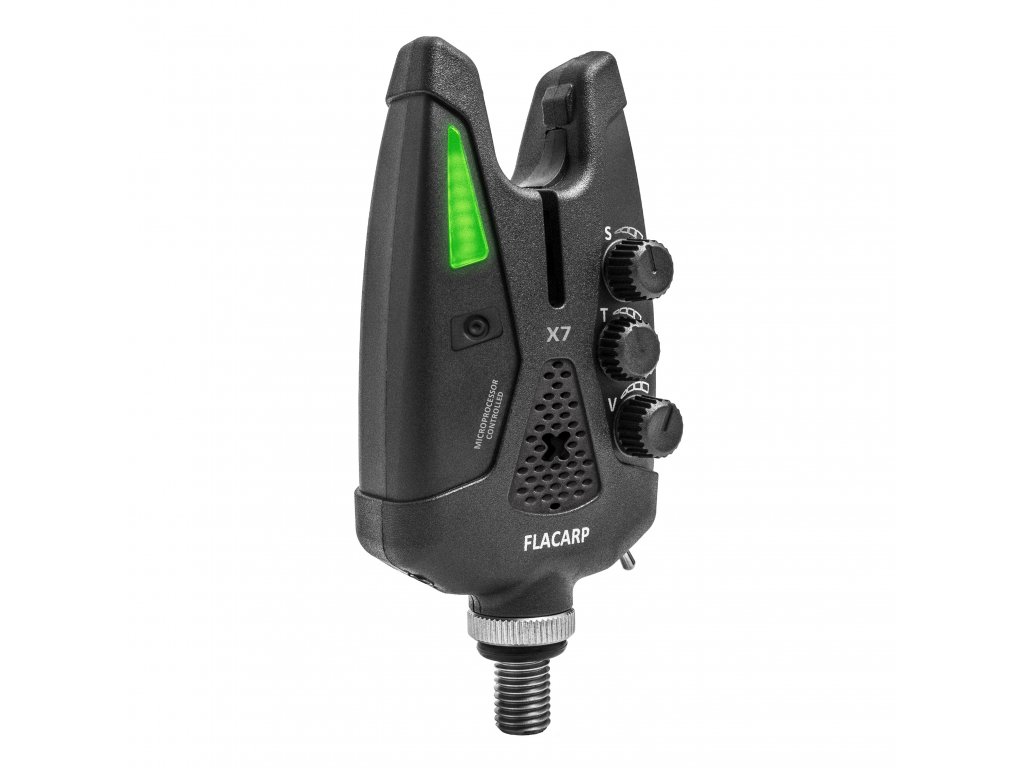Nové špičkové signalizátory záběru FLACARP X7 jsou vybaveny revolučním ultracitlivým snímačem, reagujícím již od cca 1,5mm potahu vlasce v obou směrech (i padák) s možností regulace délky potahu v širokém rozsahu. Přidali jsme nový rozsah tónů od oblíbeného hlubokého „kvákání” až po vysoké tóny s plynulou regulací hlasitosti. A nechybí ani oblíbená optická signalizace s možností nastavení barvy a jasu RGB LED. A k tomu všemu extrémní mechanická odolnost a bezstarostné napájení běžnými tužkovými články AAA. Základní vlastnosti_ Nové snímání s ultra-jemným vyhodnocením potahu vlasce v obou směrech s možností nastavení délky potahu vlasce v širokém rozsahu Tlačítko pro snadné ovládání funkcí (MUTE, poziční LED ...) Páčkový přepínač pro snadné a intuitivní zapnutí a vypnutí Zvukový měnič s velkým výkonem a odolností i proti silnému dešti Intuitivní RGB LED signalizace ukazující směr odvíjení vlasce (padák) Možnost nastavení barvy a jasu RGB LED (možnost vypnutí LED) Akustická signalizace s regulací výšky tónu a hlasitosti Integrován bezdrátový příposlech s velkým dosahem Poziční noční LED dioda Přehledná signalizace stavu baterie Konektor pro připojení swingeru (JACK 2,5mm) Neuvěřitelná pevnost materiálu: nepraskající krabičky a neprotáčející se šrouby- Odolnost proti dešti zajišťuje sada těsnění Kovová oska kladky se ani při rychlé jízdě „nezapeče” Napájeno běžnými články velikosti AAA (mikrotužky)Doplňkové parametry