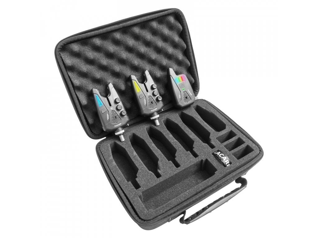 Sada signalizátorů FLACARP X7 + přijímač FLACARP RX7, ochranné pouzdro, šňůrka na krk, sada kvalitních baterií GP Ultra alkaline. Vyberte si velikost sady v horním menu. Nabízíme variantu 2+1, 3+1 a 4+1. Nové špičkové signalizátory záběru FLACARP X7 jsou vybaveny revolučním ultracitlivým snímačem, reagujícím již od cca 1,5mm potahu vlasce v obou směrech (i padák) s možností regulace délky potahu v širokém rozsahu. Přidali jsme nový rozsah tónů od oblíbeného hlubokého „kvákání” až po vysoké tóny s plynulou regulací hlasitosti. A nechybí ani oblíbená optická signalizace s možností nastavení barvy a jasu RGB LED. A k tomu všemu extrémní mechanická odolnost a bezstarostné napájení běžnými tužkovými články AAA. Základní vlastnosti signalizátor FLACARP X7_ Nové snímání s ultra-jemným vyhodnocením potahu vlasce v obou směrech s možností nastavení délky potahu vlasce v širokém rozsahu Tlačítko pro snadné ovládání funkcí (MUTE, poziční LED ...) Páčkový přepínač pro snadné a intuitivní zapnutí a vypnutí Zvukový měnič s velkým výkonem a odolností i proti silnému dešti Intuitivní RGB LED signalizace ukazující směr odvíjení vlasce (padák) Možnost nastavení barvy a jasu RGB LED (možnost vypnutí LED) Akustická signalizace s regulací výšky tónu a hlasitosti Integrován bezdrátový příposlech s velkým dosahem Poziční noční LED dioda Přehledná signalizace stavu baterie Konektor pro připojení swingeru (JACK 2,5mm) Neuvěřitelná pevnost materiálu: nepraskající krabičky a neprotáčející se šrouby- Odolnost proti dešti zajišťuje sada těsnění Kovová oska kladky se ani při rychlé jízdě „nezapeče” Napájeno běžnými články velikosti AAA (mikrotužky) Základní vlastnosti a funkce příposlechu FLACARP RX7_ - věrný přenos odvíjení vlasce - vyhodnocení zpětného směru (padák) - dosah (vzdálenost) od signalizátorů záběru až 1500 metrů* - výkonná zvuková signalizace s regulací hlasistosti - nově osazeno odolným piezokeramickým reproduktorem - vyhodnocuje alarm od nových čidel FLACARP-SENS i FLACARP AL1(AL2) - multibarevná RGB LED signalizace - paměťová funkce LED s rozlišením padáku - vibrace (lze zapnout / vypnout) - napájení běžnými bateriemi 2xLR03 (mikrotužka AAA) - dlouhá výdrž baterie - signalizace stavu baterie Mechanické vlastnosti přípsolechu RX7_ - výška přijímače 90mm - šířka přijímače ve spodní části 50mm, v horní (pod anténou) 39mm - tloušťka přijímače 26,5mm (meřeno ve spodní části) - možnost zavěšení na krk (poslední obrázek), šňůrka součástí balení * extrémní dosah vysílače je u našich výrobků zcela unikátní. Není zde proto, aby byl rybář příliš vzdálen od prutů, ale zaručuje velmi dobrou prostupnost přes překážky, např. hráze, terénní nerovnosti a jiné překážky, zejména kovové. Dosah se uvádí ve volném prostoru (přímá viditelnost), překážky, zejména kov, železobeton, terén, jej výrazně zkracují. Výkon našeho příposlechu Vám zaručí spolehlivý přenos záběru i v náročných podmínkách, kde ostatní výrobky selhávají.Doplňkové parametry