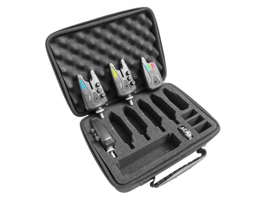 Sada signalizátorů FLACARP X7 + přijímač FLACARP RX7, ochranné pouzdro, šňůrka na krk, sada kvalitních baterií GP Ultra alkaline. Vyberte si velikost sady v horním menu. Nabízíme variantu 2+1, 3+1 a 4+1. Nové špičkové signalizátory záběru FLACARP X7 jsou vybaveny revolučním ultracitlivým snímačem, reagujícím již od cca 1,5mm potahu vlasce v obou směrech (i padák) s možností regulace délky potahu v širokém rozsahu. Přidali jsme nový rozsah tónů od oblíbeného hlubokého „kvákání” až po vysoké tóny s plynulou regulací hlasitosti. A nechybí ani oblíbená optická signalizace s možností nastavení barvy a jasu RGB LED. A k tomu všemu extrémní mechanická odolnost a bezstarostné napájení běžnými tužkovými články AAA. Základní vlastnosti signalizátor FLACARP X7_ Nové snímání s ultra-jemným vyhodnocením potahu vlasce v obou směrech s možností nastavení délky potahu vlasce v širokém rozsahu Tlačítko pro snadné ovládání funkcí (MUTE, poziční LED ...) Páčkový přepínač pro snadné a intuitivní zapnutí a vypnutí Zvukový měnič s velkým výkonem a odolností i proti silnému dešti Intuitivní RGB LED signalizace ukazující směr odvíjení vlasce (padák) Možnost nastavení barvy a jasu RGB LED (možnost vypnutí LED) Akustická signalizace s regulací výšky tónu a hlasitosti Integrován bezdrátový příposlech s velkým dosahem Poziční noční LED dioda Přehledná signalizace stavu baterie Konektor pro připojení swingeru (JACK 2,5mm) Neuvěřitelná pevnost materiálu: nepraskající krabičky a neprotáčející se šrouby- Odolnost proti dešti zajišťuje sada těsnění Kovová oska kladky se ani při rychlé jízdě „nezapeče” Napájeno běžnými články velikosti AAA (mikrotužky) Základní vlastnosti a funkce příposlechu FLACARP RX7_ - věrný přenos odvíjení vlasce - vyhodnocení zpětného směru (padák) - dosah (vzdálenost) od signalizátorů záběru až 1500 metrů* - výkonná zvuková signalizace s regulací hlasistosti - nově osazeno odolným piezokeramickým reproduktorem - vyhodnocuje alarm od nových čidel FLACARP-SENS i FLACARP AL1(AL2) - multibarevná RGB LED signalizace - paměťová funkce LED s rozlišením padáku - vibrace (lze zapnout / vypnout) - napájení běžnými bateriemi 2xLR03 (mikrotužka AAA) - dlouhá výdrž baterie - signalizace stavu baterie Mechanické vlastnosti přípsolechu RX7_ - výška přijímače 90mm - šířka přijímače ve spodní části 50mm, v horní (pod anténou) 39mm - tloušťka přijímače 26,5mm (meřeno ve spodní části) - možnost zavěšení na krk (poslední obrázek), šňůrka součástí balení * extrémní dosah vysílače je u našich výrobků zcela unikátní. Není zde proto, aby byl rybář příliš vzdálen od prutů, ale zaručuje velmi dobrou prostupnost přes překážky, např. hráze, terénní nerovnosti a jiné překážky, zejména kovové. Dosah se uvádí ve volném prostoru (přímá viditelnost), překážky, zejména kov, železobeton, terén, jej výrazně zkracují. Výkon našeho příposlechu Vám zaručí spolehlivý přenos záběru i v náročných podmínkách, kde ostatní výrobky selhávají.Doplňkové parametry