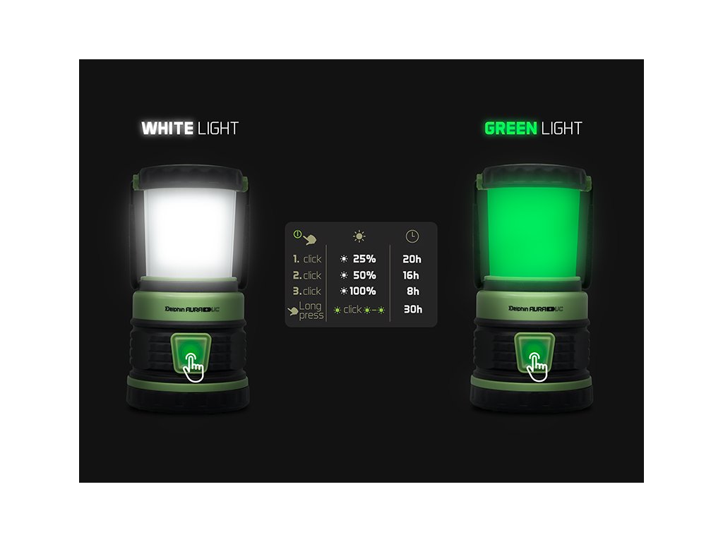 Vylepšená verze oblíbeného multifunkčního světla Delphin AURA. Oproti standardnímu modelu se pod označení AURA+ ukrývá podstatně vyšší kapacita baterie a zelené světlo, které nahradilo červené. AURA+ nabízí 3 režimy svícení bílého světla, svícení zeleným světlem (delší podržení tlačítka) a funkci světelného SOS (zeleným světlem). Lucernu je možné položit na pevný povrch, díky pogumované podstavě je velmi stabilní. Kromě toho má ve vrchní a spodní části karabiny, a tak si jí můžete zavěsit ve stanu či bivaku. Má masivní rukojeť, přenášení je velmi pohodlné a praktické. AURA+ má dokonce funkci "powerbanky", a tak si pomocí ní můžete dobít např. mobilní telefon. Lucerna se nabíjí pomocí přiloženého USB-C kabelu. Ten lze vložit do voděodolného prostoru ve spodní části lucerny, nehrozí tak jeho ztráta. Stejným kabelem pak můžete dobíjet zařízení s koncovkou USB-C. Tlačítko zapínání slouží také jako indikační dioda, díky které zjistíte stav nabití akumulátoru. Delphin AURA+ je dokonalým pomocníkem a vaším průvodcem ve tmě. Technické parametry: Rozměry: 185mmx95mm Režimy: 3 režimy svícení bílým světlem (25%-20h, 50%-16h, 100%-8h), 2 režimy zeleného světla (stálé svícení a blikání - 30h) Napájení: 3x Li-Ion zabudovaný akumulátor typ 18650, 5400mAh Výkon: 8,5W Světelný výkon: 500lm Nabíjení: USB-C (pomocí přiloženého kabelu) s funkcí powerbankyDoplňkové parametry