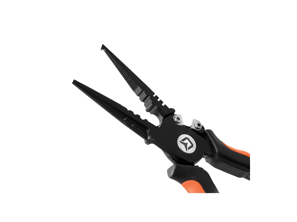 Delphin PROFISET jsou kleště s otvírákem kroužků a s postranním střihačem splétaných šňůr a vlasců. Jsou určeny pro vyprošťování háčků z tlam dravých ryb, v případech, kde na to klasický peán už nestačí. Jejich délka je 18cm. Vnitřní plocha kleští poskytuje dostatek gripu pro uchopení i velkých dvojháčků a trojháčků. Jsou vyrobeny z nerezové oceli a jejich obě rukojeti jsou vybaveny plastem oranžové a černé barvy, které jsou dobře viditelné za každých podmínek a dobře padnou do ruky. S našimi kleštěmi PROFISET dokážete napříště rybu bezpečně zbavit uvízlých háčků, otevírat kroužky, stříhat návazce nebo krimpovat s hloubkou krimpovacích čelistí 9mm. Kleště jsou dodávány s praktickým černým pouzdrem na opasek a černým natahovacím lankem vybaveným na obou koncích karabinami. Na obou ramenech rukojeti se nacházejí otvory na provlečení šňůrky.Doplňkové parametry