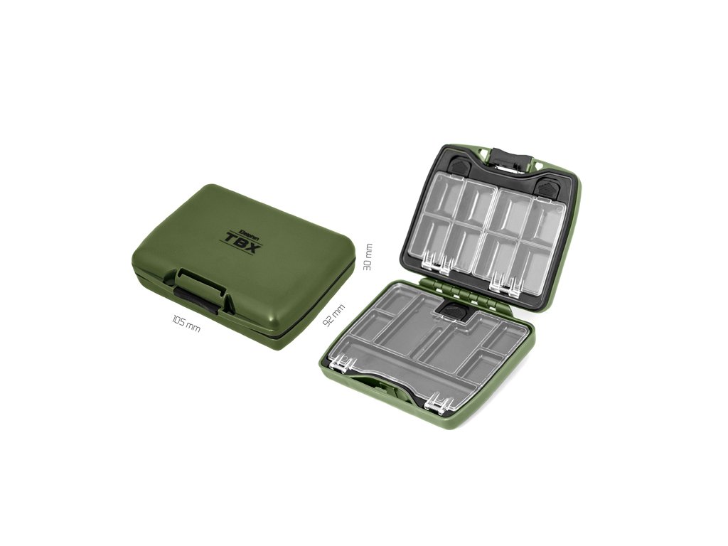 TBX Duo 105-18P je multifunkčná krabička určená na uloženie rybárskeho príslušenstva. Vyrobená je z tmavozeleného plastu, pričom uzávery pre jednotlivé sekcie sú vyhotovené z transparentného plastu, takže máte vždy prehľad o uložených veciach v jednotlivých sekciách krabičky. Technické parametre: Rozmer: 105x92x30mm Počet pevných priehradiek: 18 Rozmer priehradky: 8x(2x2,5x1cm), 4x(2x2,5x0,5cm), 3x(3x2,5x0,5cm), 2x(2x2,5x0,5cm), 1x(9x2x0,5cm) Počet vkladateľných priečinkov: 0Doplňkové parametry