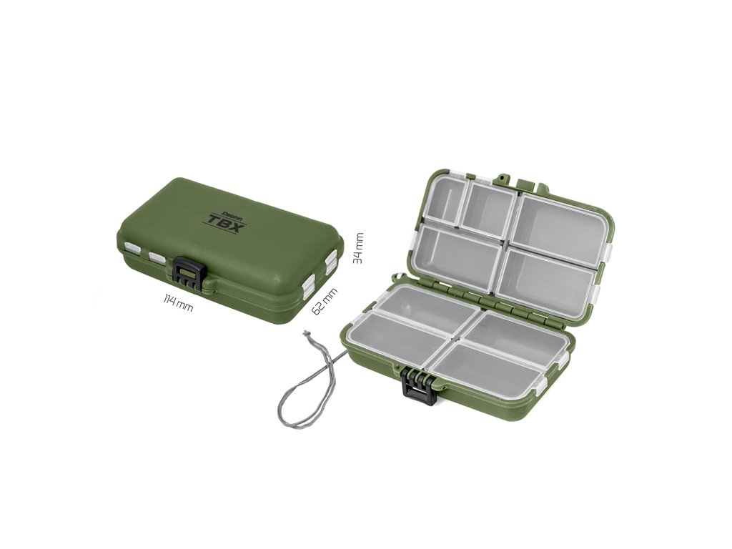 TBX Duo 114-9P je multifunkčná krabička určená na uloženie rybárskeho príslušenstva. Vyrobená je z tmavozeleného plastu, pričom uzávery pre jednotlivé sekcie sú vyhotovené z transparentného plastu, takže máte vždy prehľad o uložených veciach v jednotlivých sekciách krabičky. Dodávaná s praktickou šnúrkou sivej farby. Technické parametre: Rozmer: 114x62x34mm Počet pevných priehradiek: 7 Rozmer priehradky: 7x(5x2,5x1,5cm), 1x(2,6x2,5x1,5cm), 1x(2x2,5x1,5cm) Počet vkladateľných priečinkov: 0Doplňkové parametry