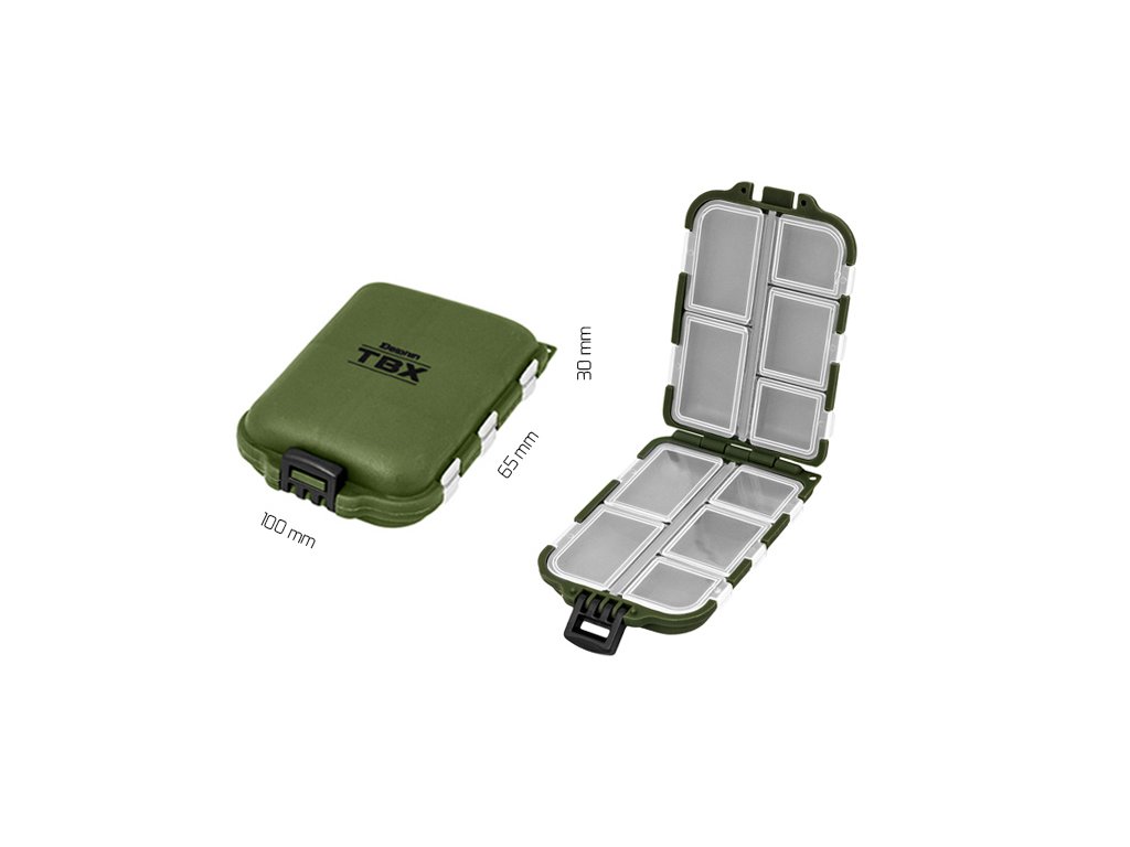 TBX One 100-10P je multifunkčná krabička určená na uloženie rybárskeho príslušenstva. Vyrobená je z tmavozeleného plastu, pričom uzávery pre jednotlivé sekcie sú vyhotovené z transparentného plastu, takže máte vždy prehľad o uložených veciach v jednotlivých sekciách krabičky. Technické parametre: Rozmer: 100x65x30mm Počet pevných priehradiek: 10 Rozmer priehradky: 4x (4x2,5x1cm), 2x(3x2,5x1cm), 4x (2,2x2x1cm) Počet vkladateľných priečinkov: 0Doplňkové parametry