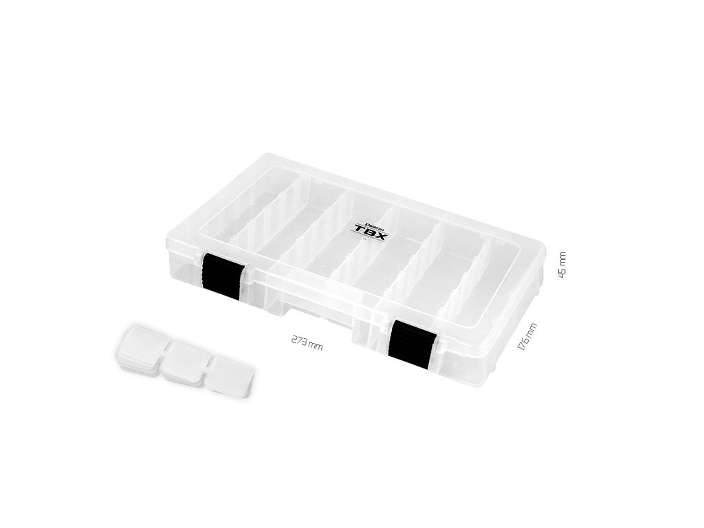 TXB ONE Clip je rada multifunkčných krabičiek určených na uloženie rybárskeho príslušenstva. Vyrobená je z transparentného plastu, takže máte vždy prehľad o uložených veciach vo vnútri krabičky. Vybavená je praktickými externými klipmi z plastu. Technické parametre: Rozmer: 273x176x45mm Počet pevných priehradiek: 6 Rozmer priehradky: 4x16,8x3,9cm Počet vkladateľných priečinkov: 15Doplňkové parametry