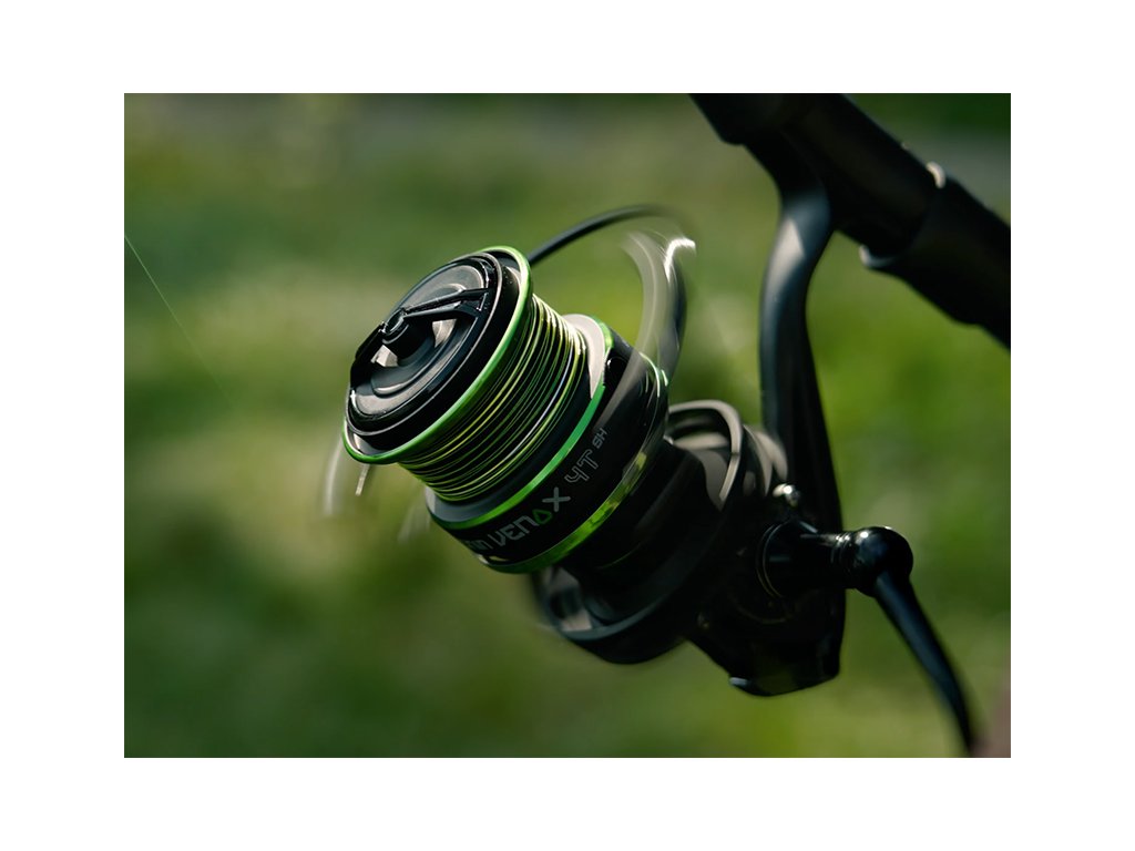 Delphin VENOX je ideálním navijákem pro příznivce lovu na feeder, hledající vynikající výkon za skvělou cenu. Když si vezmete tento naviják do ruky, budete mít doslova pocit jako byste lovili s navijákem ze zcela jiné třídy. Naviják disponuje až sedmi kuličkovými ložisky (6+1) a tím pádem mají všechny namáhané části dostatečnou sílu a pracují efektivněji. Převodový poměr 5.1:1 při menších velikostech a 5.5:1 při velikosti 6000 zajišťují optimální návin vlasce při častém přehazování a stahování montáží. Černá kovová cívka se zelenými detaily je široká a mělká, čímž perfektně vyhovuje požadavkům feederové techniky a není zapotřebí navíjet si na ni kilometry vlasce nízkého průměru. Po obou stranách se nacházejí kvalitní černé kovové klipy pro zachycení vlasce. Pod cívkou se nachází lesklá zelená ochrana proti sklouznutí vlasce, která brání nechtěnému zamotávání. Brzda navijáku je dostatečně citlivá, čímž je ideální pro používání s jemnými feederovými pruty. Pevný kovový překlápěč a rolnička vylepšují odolnost a životnost VENOXu. Štíhlá kovová černá klika je zakončena ergonomicky tvarovaným gumovým madlem s karbonovou úpravou, které se příjemně drží v ruce a vylepšuje požitek z navíjení. Tělo navijáku je laděno do černé barvy s efektními výřezy na více místech a doplňky s karbonovým efektem. Technické parametry: Delphin VENOX 4T SH | vel.4000 Kapacita navijáku mm/m: 0.20/230m, 0.22/190m, 0.25/145m Převodový poměr: 5.1:1 Počet ložisek: 6+1 Hmotnost: 282g Delphin VENOX 4.5T SH | vel.4500 Kapacita navijáku mm/m: 0.20/248m, 0.22/205m, 0.25/159m Převodový poměr: 5.1:1 Počet ložisek: 6+1 Hmotnost: 290g Delphin VENOX 5T SH | vel.5000 Kapacita navijáku mm/m: 0.22/226m, 0.25/175m, 0.28/140m Převodový poměr: 5.1:1 Počet ložisek: 6+1 Hmotnost: 303g Delphin VENOX 6T SH | vel.6000 Kapacita navijáku mm/m: 0.25/223m, 0.28/178m, 0.30/155m Převodový poměr: 5.5:1 Počet ložisek: 6+1 Hmotnost: 377gDoplňkové parametry