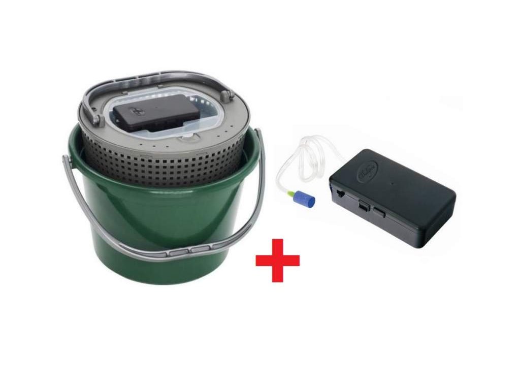 Bateriový vzduchovací motůrek, který je napájen dvěma bateriemi.