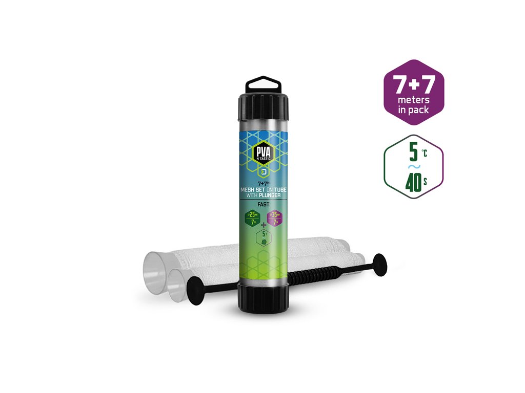Praktické 2v1 balení, které se skládá z kombinace 25mm a 35mm punčochy s tubami a plničem. PVA punčocha s kratší dobou rozpadu je ideální pro lov během chladnějších měsíců, nebo při lovu v mělčích hloubkách, kde montáž klesá kratší ke dnu. Jedná se o vysoce kvalitní produkt, při kterém díky důkladnému pletení nedochází ke svévolnému trhání punčochy a zároveň se výborně plní i velmi jemnými částicemi, čímž budete moci spolu s nástrahou poslat do vody i maximálně atraktivní návnadu přímo na montáži. Součástí balení jsou dvě tuby a tlouk, které umožňují snadné plnění punčochy vnadící směsí. PVA punčocha se po čase přímo úměrném teplotě vody rozpustí a tak uvolní krmnou směs v bezprostřední blízkosti nástrahy, čímž výrazně zvýší její atraktivnost pro kaprovité ryby. Upozornění: PVA produkty jsou vodou rozpustné, manipulujte s nimi proto jen se suchýma rukama, aby nedošlo k jejich deformaci či poškození. Technické parametry: Průměr: 25mm(úzká), 35mm(široká) Délka: 7+7m Doba rozpustnosti: cca 40s/5°C vodaDoplňkové parametry