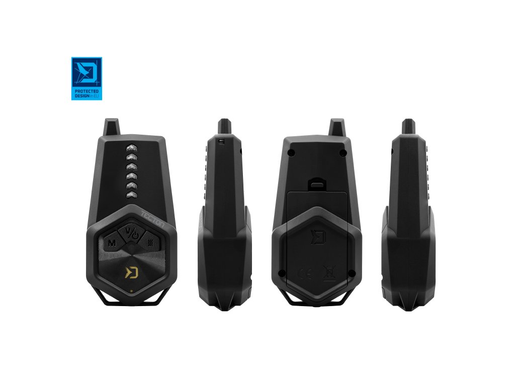 Od prvotního konceptu až po finální produkt prošla opravdu dlouhá doba. Vývoj, konzultování, designování a testování na různých Evropských vodách. To vše předcházelo uvedení sady TECTON na trh. Jedinečný vzhled z dílny designérů značky Delphin se spojil s inovativním vývojem a spolehlivou elektronikou, což v konečném důsledku vytváří vysoce funkční, originální sadu s bezkonkurenční cenou. TECTON disponuje všemi nezbytnými vlastnostmi pro plnohodnotný lov během vašich výprav za kapry. Základem je spolehlivá světelná, zvuková či vibrační signalizace záběru za jakýchkoliv povětrnostních podmínek. Nechybí ani důležité funkce jako možnost nastavení tónu, hlasitosti či citlivosti. Samozřejmostí v tomto případě je také absolutní voděodolnost a excelentní výdrž baterií. Tělo signalizátorů a příposlechu je vyrobeno z pevného plastu, což zaručuje vysokou odolnost vůči mechanickému poškození. Plast je navíc potažen jemnou pogumovanou vrstvou, čímž je velmi příjemný na dotek a vytváří dojem podstatně dražší sady. Signalizátor je vybaven třemi tlačítky. Pomocí tlačítka uprostřed je možné jej zapnout, resp. vypnout. Při delším podržení středového tlačítka se sepne podsvícení záběrového kolečka, což vytváří ve tmě velmi pěkný vizuální efekt a zároveň slouží jako noční dioda, která v noci umožňuje snadnou detekci umístění prutů. Krátkým mačkáním středového tlačítka je navíc možné zvolit jeden z osmi tónů. Pro zpětný záběr, resp. „padák“ budete upozorněni odlišným tónem signalizace. Pomocí tlačítka umístěného na signalizátoru vlevo (V) navolíte požadovanou hlasitost, včetně tichého módu. Tlačítko napravo (S) umožňuje vybrat jednu z 5 úrovní citlivosti. Součástí signalizátorů jsou odnímatelné snag gears, které se postarají o to, aby prut při prudkých záběrech v žádném případě nemohl „vyletět“ ze signalizátoru. V základní sadě 2+1 se nachází spolu s příposlechem červený a modrý signalizátor, ale v případě TECTONU je možné dokoupit až čtyři další barvy (žlutá, zelená, fialová, bílá). To dává možnost pořídit si k sadě signalizátory s barvou diody, jakou preferujete. To ovšem není jediná výhoda širokého spektra barev. Pozornému oku určitě neujde, že na přijímači se nachází až šest diod, což umožňuje spárování šesti různých signalizátorů TECTON na jeden příposlech, kdy různé barvy signalizátorů zajisté oceníte. Samotný příposlech se vyznačuje spolehlivým přijímáním signálu, v závislosti na podmínkách až do vzdálenosti 200 metrů. Disponuje možností nastavení jedné z 8 úrovní hlasitosti a možnosti zapnutí či vypnutí vibrací při záběru. Tón signalizace na přijímači je totožný s tónem, který jste si zvolili na jednotlivých signalizátorech. Pro zpětný záběr, resp. „padák“ budete upozorněni odlišným tónem signalizace. Do detailů propracovaný tvar jej umožňuje svisle položit například na stolek nebo zavěsit za popruh s poutkem (součást balení). Všechna zvolená nastavení signalizátoru i přijímače se uchovávají v paměti. Sada TECTON je napájena pomocí AAA 1,5V baterií (3x pro příposlech, 2x pro signalizátor) a při jejich nízké kapacitě vás signalizátor i příposlech upozorní blikáním v 5 sec. intervalech. Sada je dodávána v praktickém kufříku, který se postará o její bezpečnost během transportu. Technické parametry: Sada 2+1 obsahuje: - 2x Signalizátory záběru - 1x Přijímač - 1x Transportní kufřík - 2x snag gears - 1x poutko na zavěšení - 7x baterie AAA 1,5 V k otestování funkčnosti funkcí Přijímač/funkce - Voděodolný - 8 úrovní hlasitosti, včetně tichého módu (tlačítko V) - 8 různých tónů signalizace (stejný tón jako na signalizátoru) - Vibrační mód (tlačítko “vibrace“) - 6 barevných signalizačních LED diod - Zvolená nastavení uchovává v paměti - Indikace slabé baterie blikáním v 5 sec. intervalech - Párování/vymazání párování (tlačítko M) - Dosah 200m v závislosti na terénu - Napájení 3x1,5V baterie (AAA) Signalizátor/funkce - Voděodolný - 8 úrovní hlasitosti, včetně tichého módu (tlačítko V) - 8 různých tónů signalizace (tlačítko T) - 5 úrovní citlivosti (tlačítko S) - Zvolená nastavení uchovává v paměti - Signalizace zpětného záběru - odlišný tón - Paměťová dioda - svítí nepřetržitě 15 sec. po záběru - Indikace slabé baterie blikáním v 5 sec. intervalech - Podsvícená rolnička - Možnost osazení snag gearů (součást balení) - Vstup pro 2.5mm konektor - Napájení 2x1,5V baterie (AAA) V kufříku sady Tecton navíc naleznete zdarma i set základních baterií. Slouží k otestování modelu a funkcí při koupi produktu. Pro používání na rybách doporučujeme zakoupit nový set baterií. PROTECTED DESIGN - Tento produkt byl kompletně navržen designéry značky Delphin. Jeho design a technické řešení jsou natolik unikátní, že je registrován a chráněn na území celé Evropské unie.Doplňkové parametry