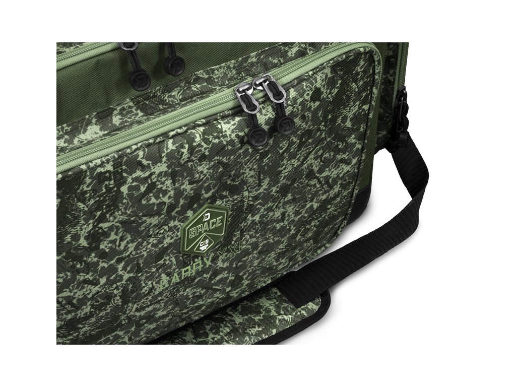 Delphin SPACE je označení pro exkluzivní sérii tašek z dílny značky Delphin. Vyznačuje se špičkovým zpracováním, kvalitními zipy, ale zejména výjimečným designem s použitím C2G kamufláže. CarryALL 2XL v provedení C2G je praktická taška pro uložení a transport rybářského příslušenství či oblečení. Naprojektována byla s důrazem na praktičnost, trvanlivost a odolnost vůči nepříznivým povětrnostním vlivům. Ze všech stran je důkladně polstrována 6mm silnou vrstvou, pro maximální ochranu výbavy uvnitř. Díky polstrování stěn je mimořádně stabilní i v případě, že je zcela prázdná. Celá spodní část a boky do výšky až 5 cm jsou opatřeny kvalitním nepromokavým materiálem. Nehrozí tak znečištění a následně znehodnocení produktu při položení například na mokrou nebo špinavou zem. Taška navíc disponuje 3 vnějšími zipovatelnými kapsami pro uložení dalšího příslušenství. Uvnitř najdete ještě jednu velkou síťovou kapsu. Samotný vnitřek je navržen tak, abyste do něj s lehkostí ukládali další tašky série SPACE či AREA. Maximální komfort dotváří mimořádně měkké polstrování popruhu pro zavěšení na rameno či praktické rukojeti pro nošení tašky v ruce. Technické parametry XXL: Rozměr tašky: 60x35x36cm Čistý rozměr vnitřního prostoru: 55x29x32cm Rozměr přední kapsa: 35x25x5cm Rozměr boční kapsy: 25x25x5cm Vnitřní síťovaná kapsa: 48x29cm Stylová patentovaná kamufláž z dílny značky Delphin pod označením C2G má mnoho podob a úhlů pohledu. Přesně tak i její název, který můžeme volně přeložit jako Carpath 2. generace, což přímo odkazuje na jejího předchůdce, ale můžeme ho číst i jako Carpath to Green, tedy přechod myšlenky Carpathu do zelené barvy. Její jedinečnost a nezaměnitelnost spočívá v prvcích, ze kterých je vytvořena. Na první dojem jde o kamufláž tvořenou třemi různými odstíny zelené. Všechno se však změní při detailnějším pohledu, kdy si všimnete siluety kaprů, komponentů kaprařské montáže a log značky Delphin spolu s označením C2G. Díky tomuto neopakovatelnému provedení se vaše rybářská výbava okamžitě stane jedinečnou a maximálně originální.Doplňkové parametry