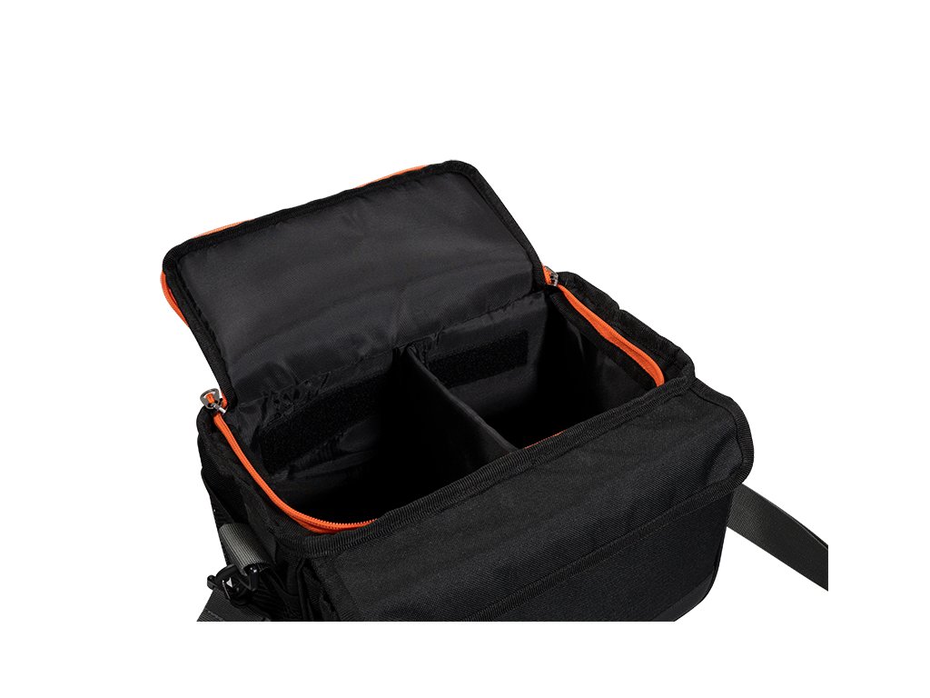 Důmyslně propracovaná a praktická taška v elegantně-sportovním Darx ATAK! designu. Díky svým parametrům je ideální volbou pro kratší vycházky k vodě a dokonale zapadne do výbavy každého příznivce přívlače. Tašku jsme navrhli tak, aby byly všechny odkládací prostory pro lovce dobře přístupné i v případě, kdy ji mají právě na sobě při lovu. Proto jsme navrhli víko vnitřního prostoru tak, aby jej bylo možné otevřít směrem od rybáře. Vnitřní prostor lze předělit příčkou na suchý zip a také je možné si jej přizpůsobit dle vlastních potřeb. Na obou stranách se nachází předělená kapsa ze síťoviny, do kterých lze odložit drobnosti. V zadní části se nachází kapsa na suchý zip, která obsahuje jednu plastovou krabici s vyjímatelnými příčkami. Krabice je součástí tašky a je vybavena odnímatelnými vnitřními příčkami. Na přední části je umístěna i kapsa na zip, která poslouží například na odložení rybářských dokladů, peánu a pod. Navržena byla s důrazem na praktičnost, trvanlivost a odolnost. Brašna je ze všech stran osazena polstrováním pro maximální ochranu vašeho příslušenství uvnitř. Celá spodní část tašky je osazena vyztuženou, 5cm vysokou, nepromokavou vrstvou, která dovoluje položení tašky na mokrý povrch. To ještě více přispívá k tomu, že taška je také na spodní straně mimořádně stabilní a drží si svůj tvar. Kvalitní vnější zipy oranžové barvy jsou opatřeny plastovým taháčkem na oranžovém popruhu, který je na konci rozšířen, a proto jej lze rychle uchopit. Doplňky oranžové barvy umožňují rybáři, aby byla taška dobře viditelná i za šera a uměl ji okamžitě najít. Taška je ušita z lehké, ale přitom odolné látky černé barvy. Vybavena je černým popruhem určeným pro nošení přes rameno. Design tašky doplňuje naše jedinečná tmavá Darx ATAK! kamufláž se siluetami dravých ryb. Technické parametry: Rozměr tašky: 31x23x22cm Čistý rozměr vnitřního prostoru: 28x20x19cm Rozměr přední kapsa:29x21cm Rozměr krabice: 27 x 18 x 4cm Počet přihrádek: 6-18 Možnost náhradní krabice: TBX One 275 – 1P Clip WP, TBX One 275 – 3P Clip WP, TBX One 276 – 16P Clip, TBX One 273 – 5P ClipDoplňkové parametry