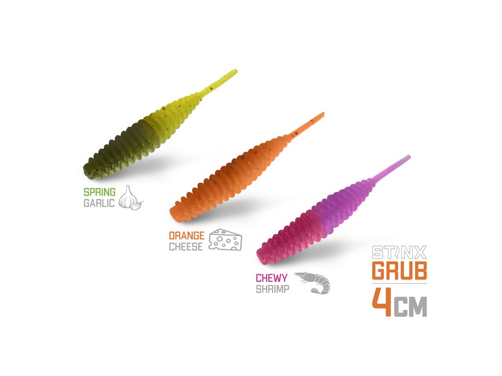 Umělá nástraha Delphin B! StinxGRUB Je měkká nástraha imitující červy nebo různé vodní bezobratlé, vhodná zejména pro vyznavače ultralehké přívlače. Díky univerzálnímu tvaru nástrahy ji lze nastražit různým způsobem a lovit různé druhy ryb. Své uplatnění najde při lovu pstruha či okouna, určitě jí však nepohrdne i větší dravec či kaprovitá ryba. Štíhlé válcovité tělo a výrazným obvodovým žebrováním po celé délce dodává nástraze velmi specifický pohyb a neodolatelné vibrace. Plovoucí materiál způsobuje nadnášení ve vodě, čímž nástraha působí velmi živě. Nástraha je k dispozici v několika účinných barevných kombinacích, které jistě zaujmou zrak nejednoho dravce. Použité barvy jsou navíc UV aktivní, což způsobuje intenzivnější odraz slunečního záření pod vodou, díky čemuž se nástrahy stávají nepřehlédnutelnými i ve velkých hloubkách nebo za slabých světelných podmínek. Pro zvýšení atraktivity jsou nástrahy uloženy v nádobě s tekutým atraktantem, do kterého lze opětovně uložit použitou nástrahu, a tak ji znovu zaromatizovat. Různé příchutě nástrah umožňují lepší přizpůsobení se lovu cílové ryby nebo jejich aktuální chuti. Hmotnost nástrahy: 0,85gDoplňkové parametry