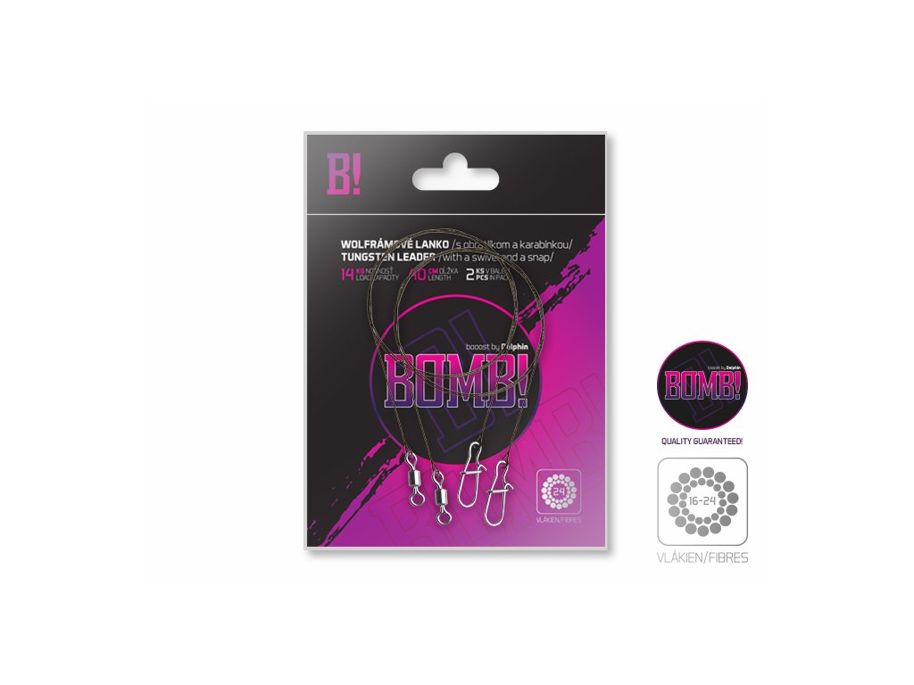 Wolframové lanko přívlačové řady BOMB! od značky Delphin je zhotovené jemným pletením wolframových vláken! Díky materiálové skladbě se s ním výborně pracuje a je vysoce odolné vůči jakémukoliv poškození. Jeho jemnost je výborná pro přirozenou prezentaci nástrahy ve vodě. Na jedné straně wolframového lanka BOMB! se nachází obratlík a na druhé karabinka, které jsou uložené ve smyčkách. V každém balení se nachází až 2 kusy tohoto odolného lanka! Velikosti obratlíků a karabinek k lankům + počet vláken: - 15cm/5kg- obratlík #14, karabínka #000 - 20cm/5kg- obratlík # 14, karabínka # 000, 16 vláken - 20cm/5kg- obratlík # 12, karabínka # 00, 12 vláken - 30cm/9kg- obratlík # 8, karabinka # 0, 16 vláken - 35cm/11kg- obratlík # 6, karabinka # 1, 20 vláken - 40cm/14kg- obratlík # 5, karabinka # 2, 24 vlákenDoplňkové parametry