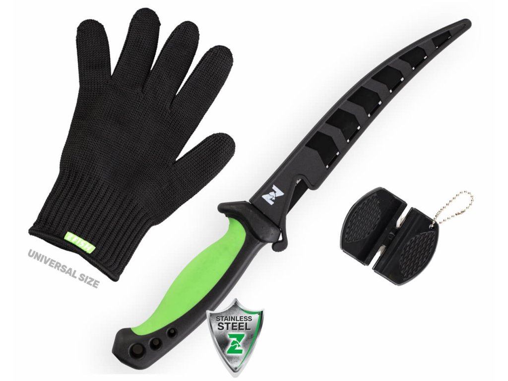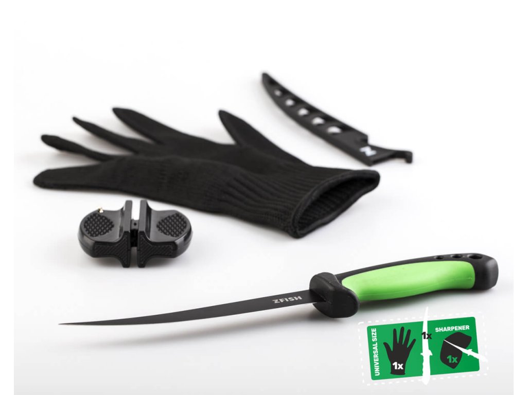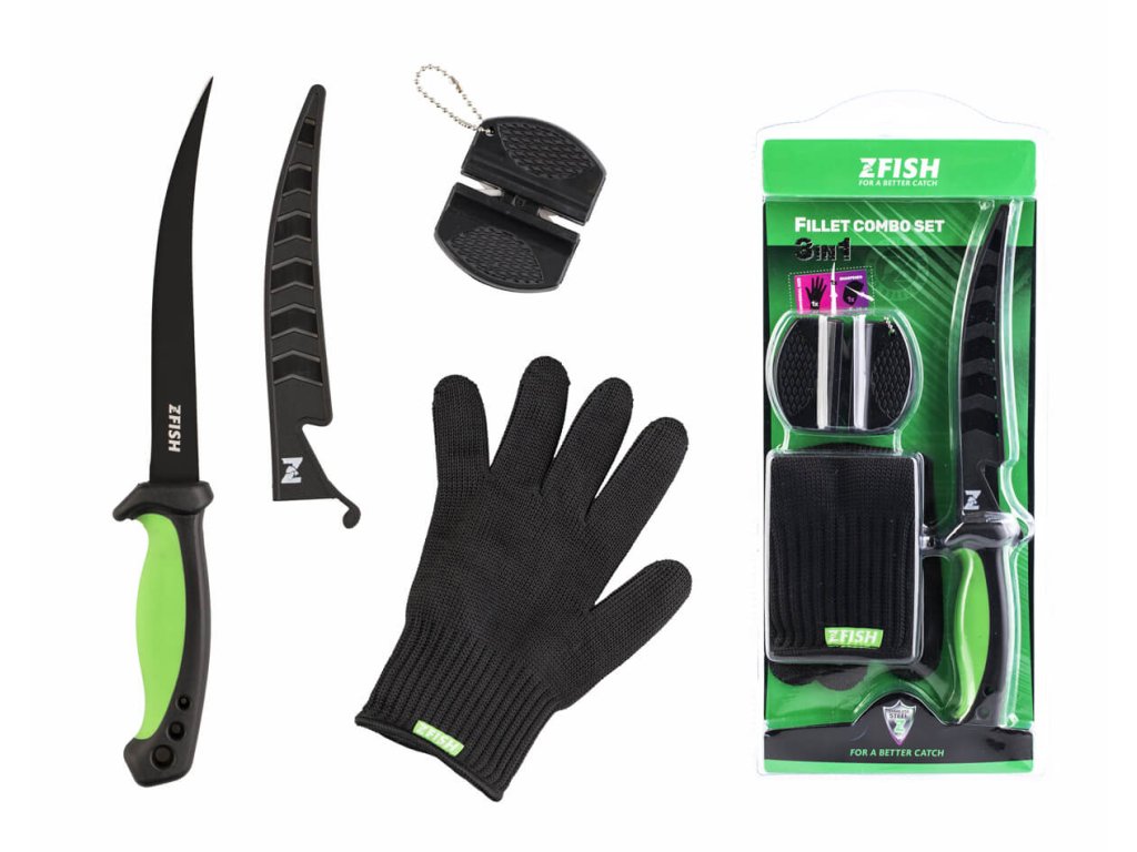 ZFISH Fillet Combo Set je combo sada složená z kvalitního filetovacího nože s pevným ochranným pouzdrem, silných rukavic z kevlarového vlákna proti pořezání a brousku na nůž.