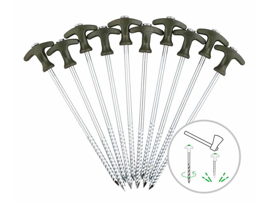 - Sada 10-ti kusů zavrtávacích kolíků pro spolehlivé ukotvení bivaků, stanů, přístřešků atd