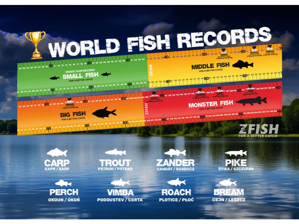 ZFISH Měřící Podložka Challenger, je šikovný a skladný metr / podložka pro snadné a přesné měření a porovnávání vašich úlovků. Měrka je opatřena bytelným plastovým dorazem přesně od nuly, takže umístění a přesné měření vašich úlovků bude velice snadné. Navíc je naše podložka speciální v tom, že design tvoří aktuální rybářské rekordy, takže hned uvidíte jak jste na tom v porovnání se světovou špičkou .). Materiál podložky je vybrán v ideálním poměru odolnosti a měkkosti, aby dlouho vydržel a byl dostatečně poddajný pro snadnou manipulaci. Pro co nejšetrnější zacházení s úlovkem je třeba podložku před každým měřením řádně namočit, aby zbytečně nedošlo ke stírání rybího slizu a riziku, že rybám nějak ublížíme.