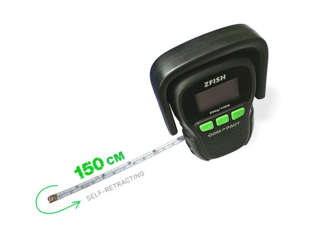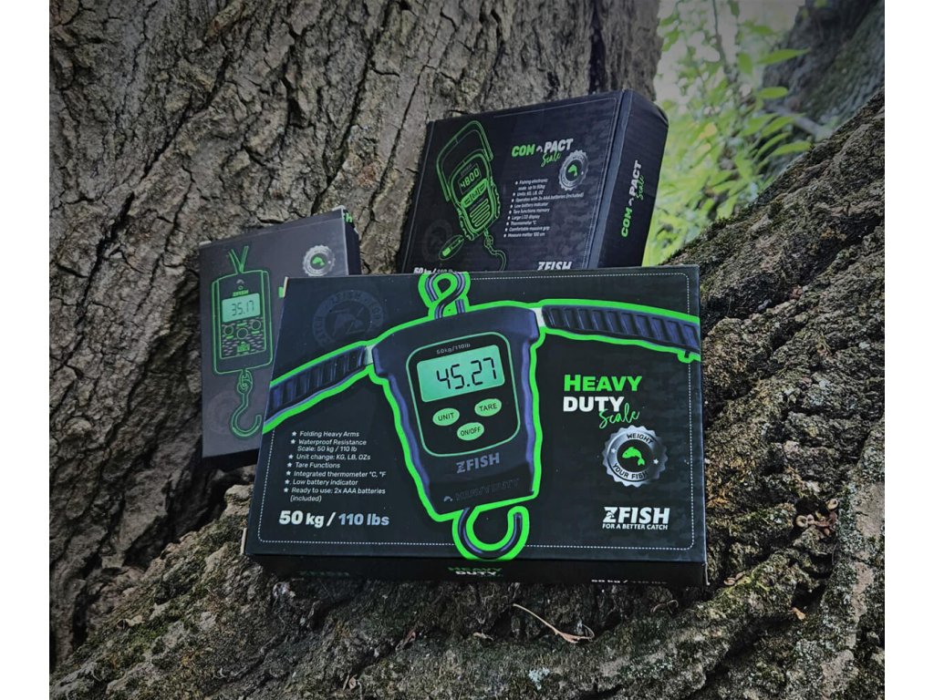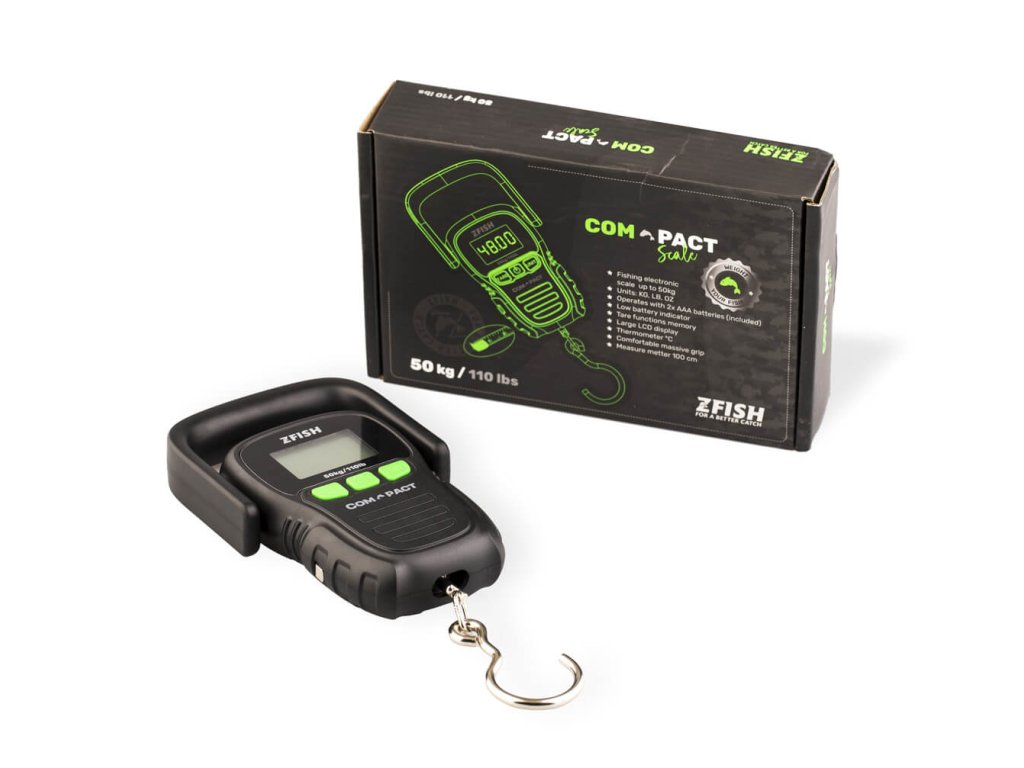 Česká značka ZFISH přichází s novým, kompaktním modelem velmi přesné digitální váhy. Tato váha umožňuje precizní vážení Vašich úlovků v rozmezí od 20g až do 50kg s jednoduchým ovládáním pomocí tří tlačítek. Zapnutí a vypnutí probíhá stisknutím tlačítka ON/OFF. Krátkými stisky tlačítka UNIT změníte jednotky hmotnosti (kg, lbs, oz), na displeji. Funkce TARE umožňuje odečet hmotnosti vážících pomůcek jako jsou saky a tašky. Kromě těchto funkcí váha disponuje podsvíceným displejem, digitálním teploměrem a indikací stavu baterie a rizika přetížení. Váha Compact Scale je navíc opatřena 150 cm samonavíjecím pásmem, takže úlovek si nejen snadno zvážíte, ale také změříte jeho přesnou délku. Velkou výhodou při manipulaci je pevná, masivní, integrovaná rukojeť, kterou je navíc možné zasunout tak, aby měla váha co nejmenší rozměry při transportu.